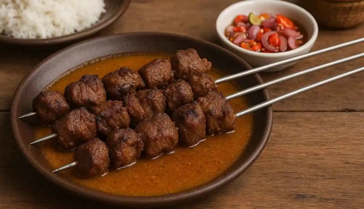 Sate klathak biasanya disajikan bersama kuah gulai yang gurih dan beraroma rempah. Kuah ini menjadi pelengkap sempurna bagi sate yang dibumbui sederhana, memberikan rasa kaya tanpa menutupi kelezatan asli daging.